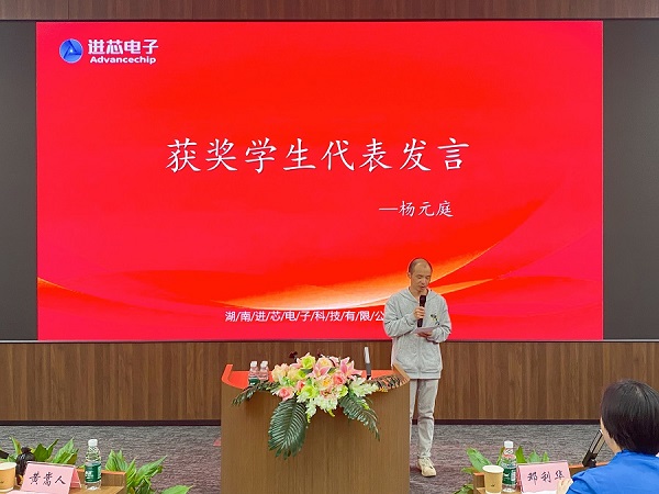 “進芯電子獎學(xué)金”獲獎學(xué)生代表發(fā)言,他感謝進芯電子對青年學(xué)子的支持,感謝學(xué)校對自身的培養(yǎng),表示深耕專業(yè)知識、厚植家國情懷是成才的必經(jīng)之路,他將再接再厲,勇創(chuàng)佳績。
