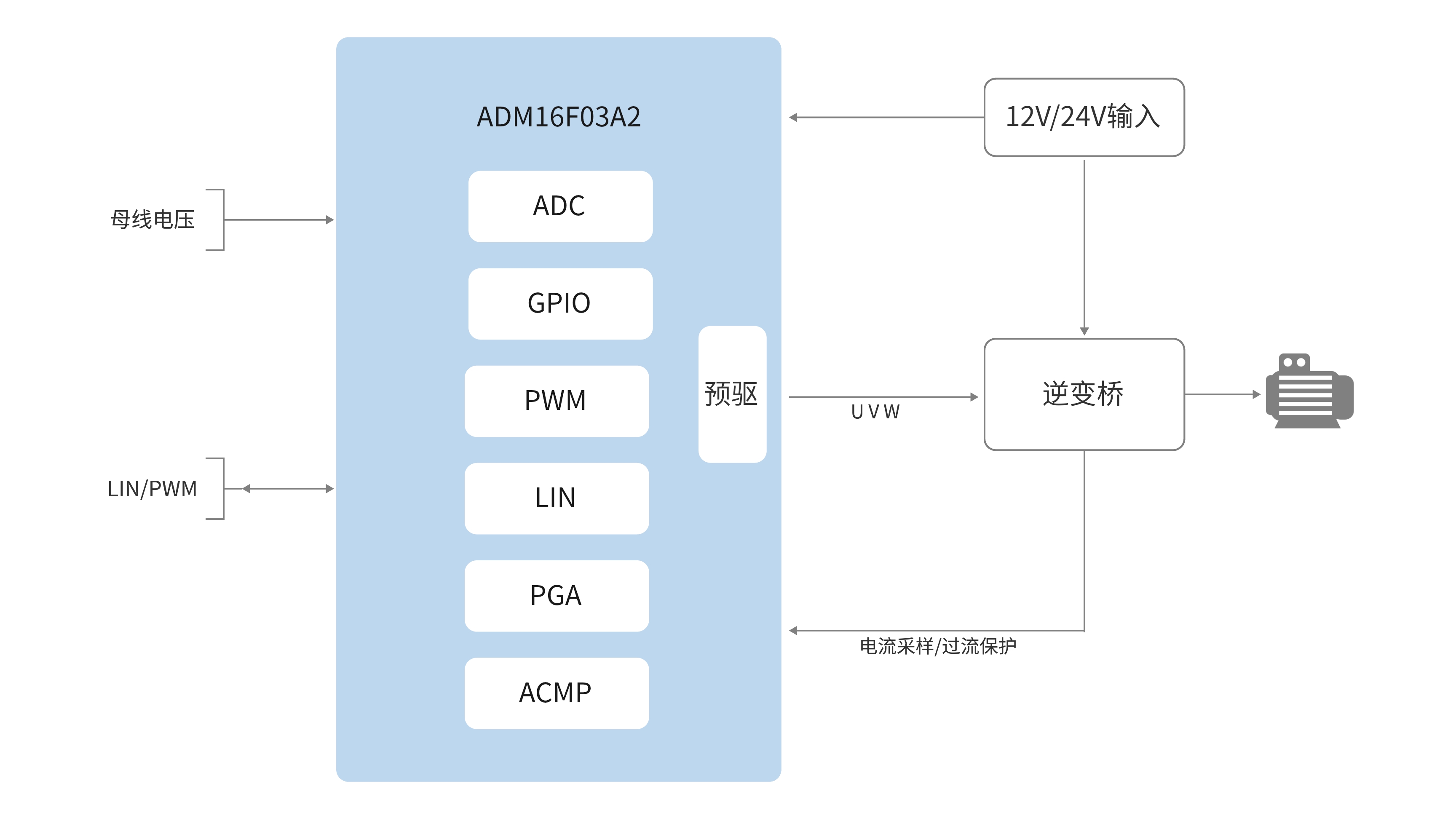 該方案采用自研無感單電阻FOC算法,具備母線電壓ADC檢測,可通過PWM/LIN進(jìn)行控制不同的轉(zhuǎn)速及故障反饋功能;具有順逆風(fēng)啟動,噪聲小,波形控制穩(wěn)定等特點