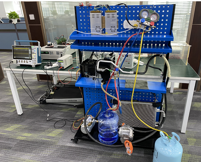 進(jìn)芯電子實(shí)驗(yàn)室具備汽車(chē)空調(diào)壓縮機(jī)帶負(fù)載測(cè)試條件,可以實(shí)現(xiàn)自由更換壓縮機(jī)、背壓、平衡壓等測(cè)試條件,下圖是進(jìn)芯電子壓縮機(jī)測(cè)試平臺(tái)。